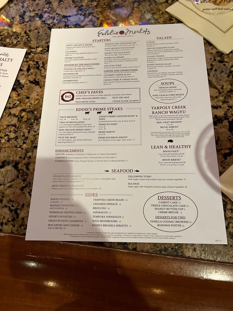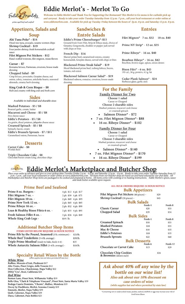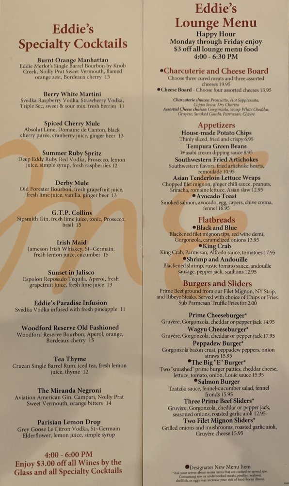 Introducing Eddie Merlot's, a sophisticated steakhouse in Pittsburgh that also offers seafood and salad options. This upscale restaurant takes reservations and offers delivery and takeout. With options for keto and vegan diets, Eddie Merlot's also caters to a diverse range of dietary preferences. The classy ambiance, moderate noise level, and attentive waiter service make it ideal for a special dinner or group gathering. The menu features a variety of dishes prepared with high-quality ingredients, from juicy steaks to fresh seafood. Whether you're looking for a romantic date night spot or a place to celebrate with friends, Eddie Merlot's is sure to impress. Don't forget to try their signature cocktails and decadent desserts for a truly unforgettable dining experience. Visit 444 Liberty Ave Ste 100 or call (412) 235-7676 to make a reservation.